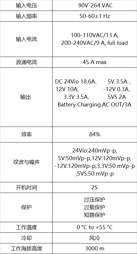 輸(shu)入(ru) 輸入電壓 ·90V-264 VAC 輸入(ru)頻率 · 50-60±1 Hz 輸(shu)入電流(liu) · 100-110VAC/13 A, 200-240VAC/9 A, full load 浪涌電(dian)流(liu) ·45 Amax 輸(shu)入保護 · Internal T15.0 A/250 V fuse in line and neutral 輸出(chu) 輸出 ·DC 24Vio 18.6A、5V3.5A、12V 10A、-12V0.3A、3.3V3.5A、5VS2A · Battery Charging.AC OUT/3A 初始設置精度 ·24Vio±1%,Other ±5% 啟(qi)動延遲 · 2S typical 啟動上(shang)升時(shi)間 · 0.15S max | 常(chang)規 功效 . Up to 84% 隔離 · 3000 VAC Input to Output . 2000 VAC Input to Ground MTBF · 20000 Hrs or more at50°C. 環(huan)境 工作環境 ·0 °Cto +55 °C 冷(leng)卻 · FAN cooled 工作濕度 ·20% to 85% RH 儲存(cun)溫度 ·-10 °Cto +60 °C 工作高(gao)度 ·3000 m 振動 ·0.5G, 5 Hz to 150Hz, 3 axes |