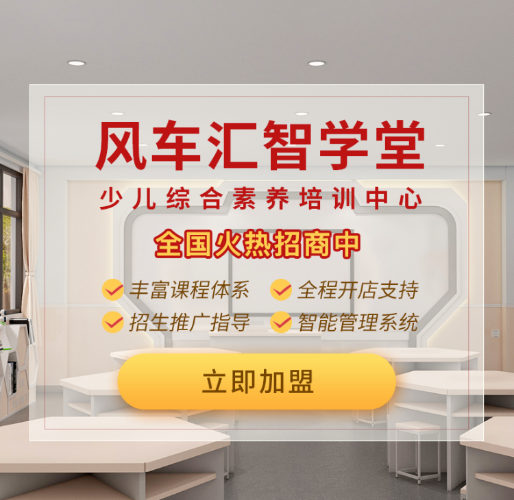 風車匯智學堂是大風車教育集團旗下的少兒綜合素質教育培訓品牌。依托國際先進的教學經驗,大風車多年的行業運營經驗和優質的教育資源,風車匯智學堂打造出集藝術、語言、文化、思維、創意等為一體的少兒綜合素質培養基地,包含思維閱讀、機器人編程、創意美術、行知國學、口才表演、音樂、舞蹈、書法、游泳、輪滑等多種課程,覆蓋了少兒素質教育全領域教學體系,形成了精細、深入、可持續的教育生態,專注為少兒提供定制化、專業化、一站式的課程服務。借助前沿科技手段,風車匯智學堂將為更多中國孩子提供更好的素質教育。