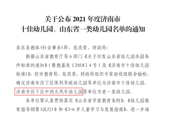 對(dui)照《濟南市示范幼(you)兒(er)園評(ping)估標準》的各項要求,專家(jia)組成員(yuan)對(dui)大風車三所幼(you)兒(er)園規范的運營管理、詳(xiang)實的檔案記錄、認真(zhen)的工作(zuo)態度(du)、專業的師資教學等方(fang)面給予充(chong)分(fen)肯定,大風車教育集團三所(suo)幼兒(er)(er)園(yuan)成功登上2021年山(shan)東(dong)省省級一類幼兒(er)(er)園(yuan)榮(rong)譽(yu)榜單。