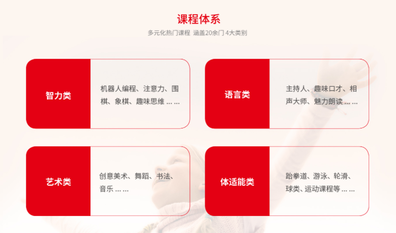 孩(hai)子在“體適(shi)能”課將獲得什么?01體適(shi)能(neng)是孩(hai)子一切運(yun)動的(de)基礎,讓孩(hai)子拒絕無效鍛煉,全面增(zeng)強身體素質(zhi);02體適能課程為孩(hai)子提供系(xi)統有趣(qu)的(de)“游戲(xi)”運動(dong)訓練,讓孩(hai)子在愛玩的(de)天性下提升身(shen)體素質(zhi);03力量、速度(du)、靈(ling)敏、平衡、協調等能力,讓(rang)孩子得到最大程度的身(shen)體(ti)發展(zhan)。