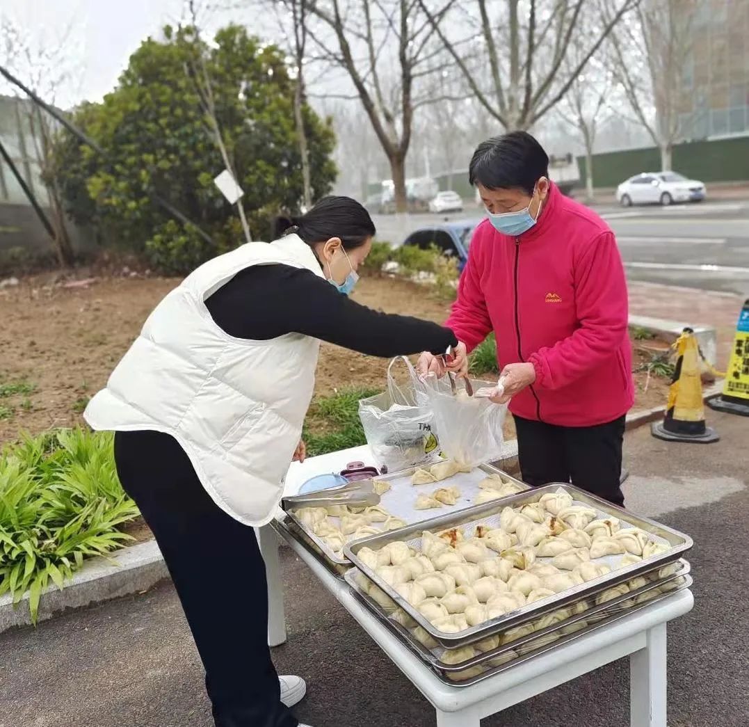 △路(lu)人、家長(chang)和孩子紛(fen)(fen)紛(fen)(fen)來幼兒園門口領(ling)取愛心(xin)早餐