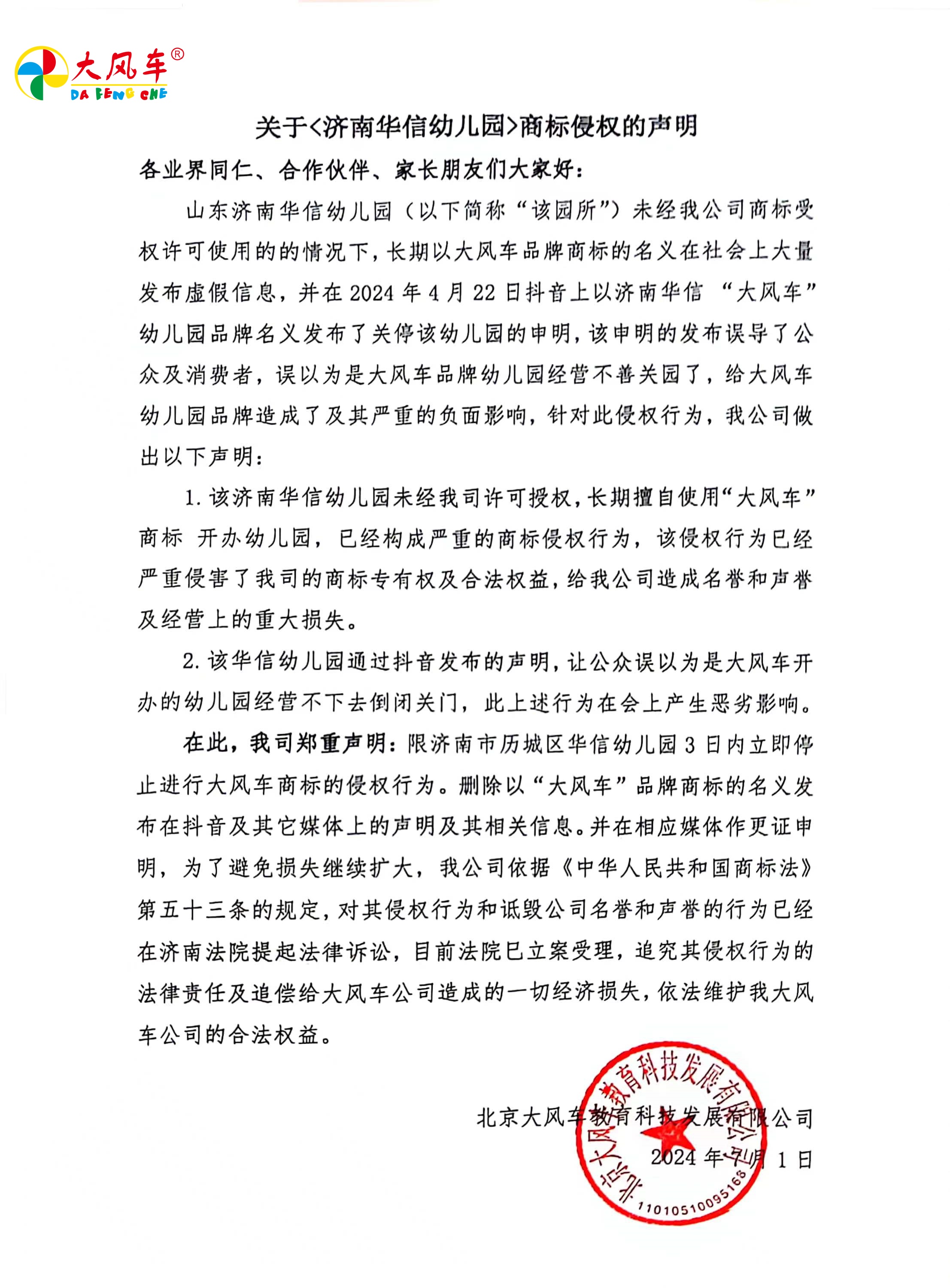 山東(dong)濟南(nan)華信幼(you)兒園(yuan)(以(yi)下簡稱“該園(yuan)所”)未經我公司(si)商標授(shou)權許可使用的(de)情況下,長期以(yi)大(da)(da)(da)風車(che)品牌(pai)(pai)商標的(de)名義(yi)在社會上大(da)(da)(da)量發布虛假信息,并在2024年4月22日抖音上以(yi)濟南(nan)華信“大(da)(da)(da)風車(che)”幼(you)兒園(yuan)品牌(pai)(pai)名義(yi)發布了關停該幼(you)兒園(yuan)的(de)申明,該申明的(de)發布誤導了公眾及消費者,誤以(yi)為是大(da)(da)(da)風車(che)品牌(pai)(pai)幼(you)兒園(yuan)經營(ying)不善關園(yuan)了,給大(da)(da)(da)風車(che)幼(you)兒園(yuan)品牌(pai)(pai)造成了極(ji)其嚴重的(de)負面影響(xiang),針(zhen)對此侵權行為,我(wo)公司做出以下聲明: