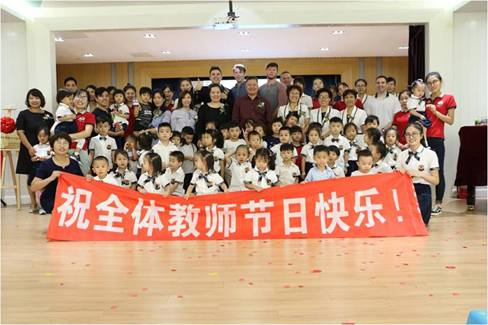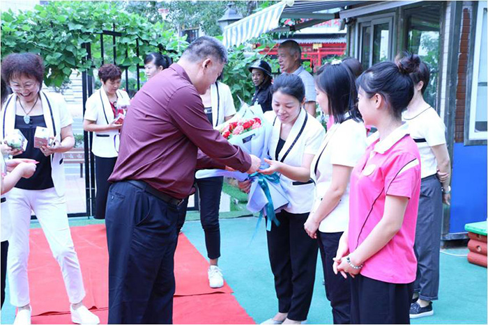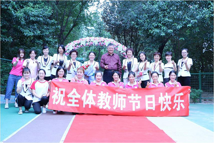 “風車寶貝,祝賀老師,節日快樂!”孩子們喊著嘹亮的口號,為老師們齊送祝福。周總與各位老師、院長一一握手、擁抱,送上節日紅包和禮物,以資鼓勵。