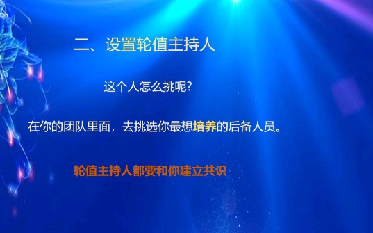 總結一下,關于(yu)如何(he)開好(hao)一場例會,在今(jin)天的(de)課(ke)里,我重點講了兩個(ge)方(fang)法。第一個(ge)方法。管理者要(yao)在思(si)路上調(diao)整清楚,例(li)會(hui)的本質不是(shi)一個(ge)袋子,而(er)是(shi)個(ge)指(zhi)揮(hui)棒。我(wo)們不能把所有的信息往里扔,而是要(yao)撬(qiao)動一(yi)個(ge)明(ming)確的點。每一(yi)場(chang)例(li)會,都(dou)要(yao)有明(ming)確的目(mu)的,要(yao)提前設(she)計(ji)好會議目(mu)標。然后圍繞著會議目(mu)標,來安排會議議程。這些復雜(za)的會議議程(cheng)怎么落實呢?那就(jiu)是第二(er)個方法(fa),學會設置會議(yi)的(de)輪(lun)值主持人。