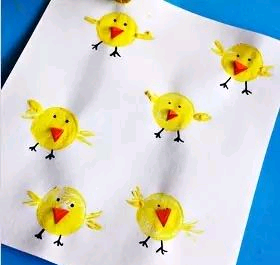 土豆切圓塊,蘸黃色顏料,在(zai)添上(shang)幾筆就(jiu)成了一(yi)只可愛的小黃雞,要是老師布(bu)置的是卡紙手(shou)工(gong),那就(jiu)先(xian)畫再(zai)剪下來~