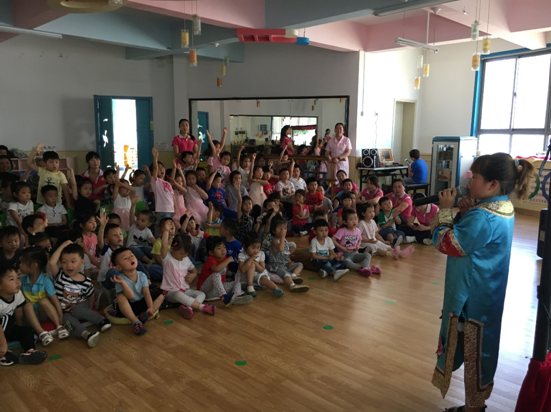 表演者共為小朋友們帶來了四個故事:《孫悟空大戰紅孩兒》 ,帶我們回顧了經典的神話故事;《金斧頭 銀斧頭》 ,使小朋友懂得了做人需要誠實的重要品質,;《仙鶴和烏龜》,增強了小朋友們解決問題的信心,在困難面前不畏首畏尾、裹足不前;最后的《熊出沒》劇目是孩子們最喜歡的,表演全程,孩子們不斷的拍手叫好。