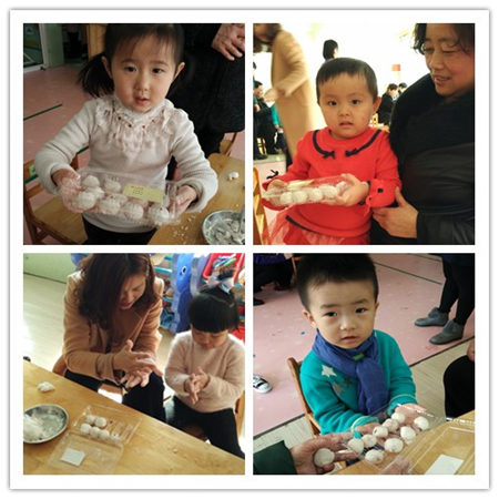 下面該輪到我們的孩子們大顯身手了,雖然他們做的有的圓,有的方,有的笑開了臉,露出了甜甜的餡兒,有的······但孩子們看到自己動手做出的元宵,臉上露出了自豪的神情,別提有多高興了。
