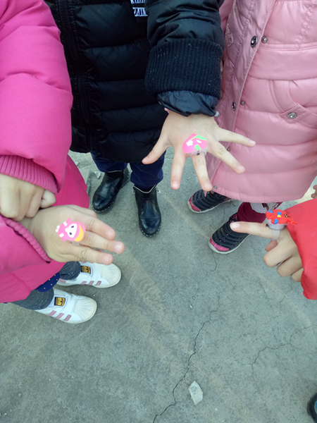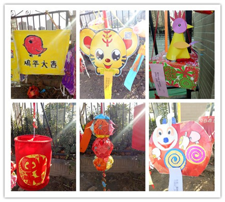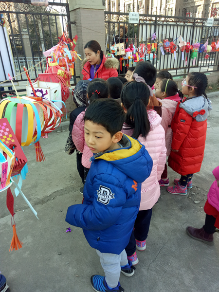 看,五顏六色的元宵花燈,那可是家長和孩子們精心制作而成的,形式不同,制作材料不同,看,有漂亮的小兔燈、小雞燈,紅包燈······。一盞盞獨特、絢麗的元宵燈,匯成了燈的海洋。