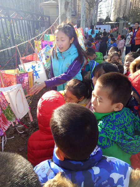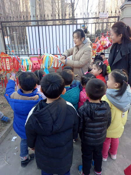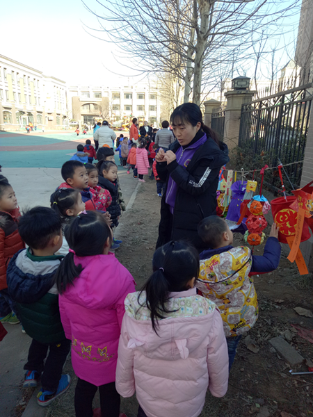 操場上,孩子們在老師的帶領下興致勃勃地觀花燈、猜燈謎,你一言我一語,場面煞是熱鬧,一片喜氣洋洋的景象。