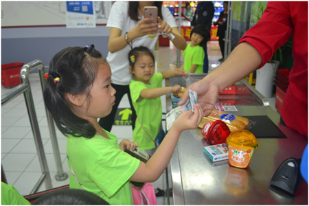 拿著錢、推著購買的禮物,到收銀臺前自己結賬。