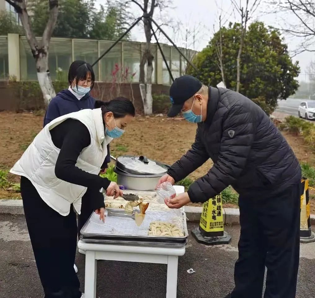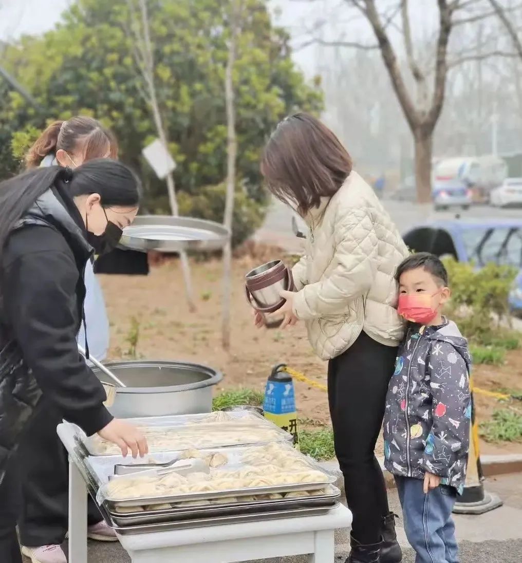 △路(lu)人、家長(chang)和孩子紛(fen)(fen)紛(fen)(fen)來幼兒園門口領(ling)取愛心(xin)早餐