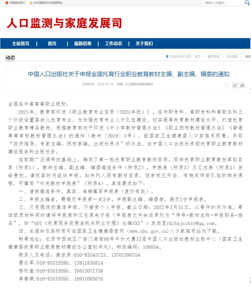 2022年3月,國家衛生健康委員會人口家庭司發布《中國人口出版社關于申報全國托育行業職業教育教材主編、副主編、編委的通知》,通知針對中職專科、高職專科和高職本科三個階段打造托育職業教育精品教材。