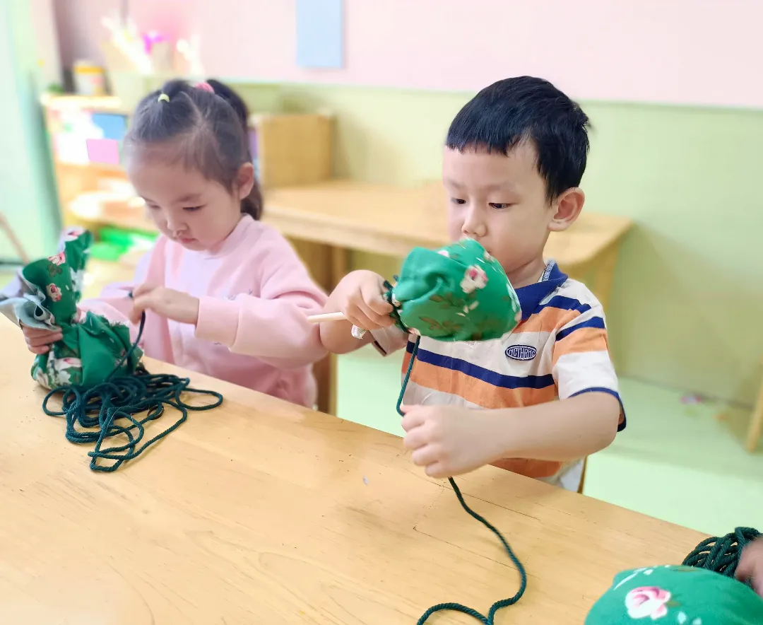 小(xiao)朋友們一起動手制作了艾(ai)草(cao)養生錘,裝上滿滿的(de)艾(ai)草(cao)用力壓(ya)一壓(ya),捏(nie)一捏(nie),把(ba)它(ta)包的(de)緊一點。