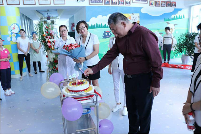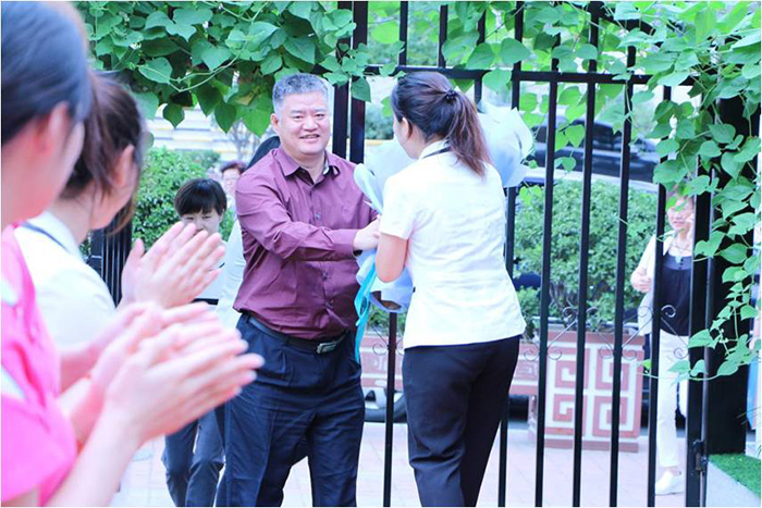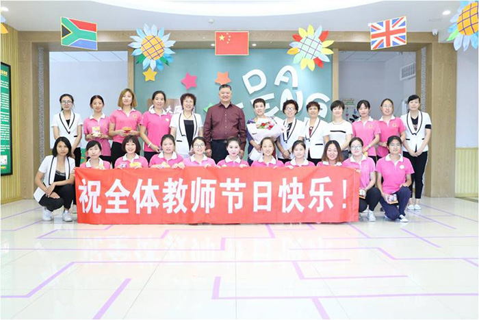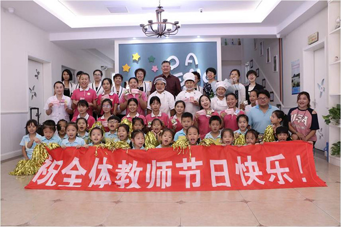 “風車寶貝,祝賀老師,節日快樂!”孩子們喊著嘹亮的口號,為老師們齊送祝福。周總與各位老師、院長一一握手、擁抱,送上節日紅包和禮物,以資鼓勵。