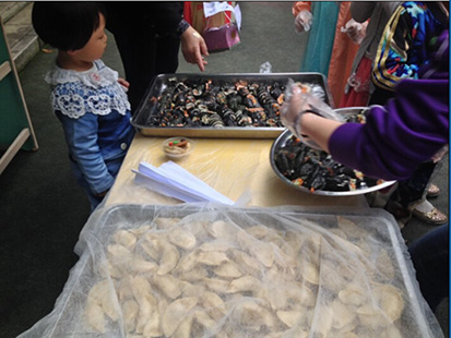上午9:10分(fen)活動(dong)正式開(kai)始,董園長(chang)對(dui)每(mei)位孩(hai)子(zi)(zi)(zi)(zi)送去了(le)深情地祝福(fu)。大班孩(hai)子(zi)(zi)(zi)(zi)與(yu)家(jia)長(chang)們(men)興致(zhi)勃勃地制作美(mei)食(shi),看著孩(hai)子(zi)(zi)(zi)(zi)們(men)能(neng)親手操作,家(jia)長(chang)心(xin)里別提有(you)多(duo)高興,每(mei)一處都洋溢著滿滿的(de)幸福(fu)!托小中班幼(you)兒則與(yu)自己的(de)爸爸媽媽在教(jiao)室里進行親子(zi)(zi)(zi)(zi)游戲(xi),兩人三足、揪尾(wei)巴(ba)游戲(xi)獲得家(jia)長(chang)們(men)和(he)孩(hai)子(zi)(zi)(zi)(zi)的(de)喜愛。朗(lang)朗(lang)的(de)笑聲,把(ba)整(zheng)個校園包裹(guo)著。10:30分(fen)我(wo)們(men)就要(yao)開(kai)始分(fen)享(xiang)美(mei)食(shi)了(le),很(hen)多(duo)寶貝(bei)們(men)都已經迫(po)不(bu)及待。三明(ming)治、彩豆餅(bing)干、餃子(zi)(zi)(zi)(zi)……每(mei)一個店鋪(pu)門(men)口都排(pai)滿了(le)客(ke)人,寶貝(bei)們(men)忙得不(bu)亦樂乎,笑聲在校園里延(yan)續著!