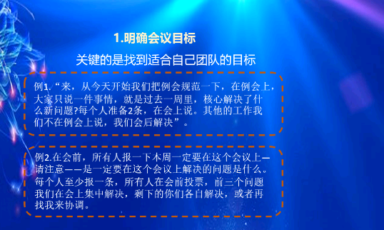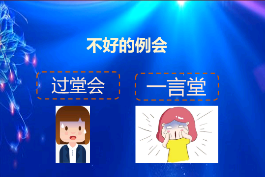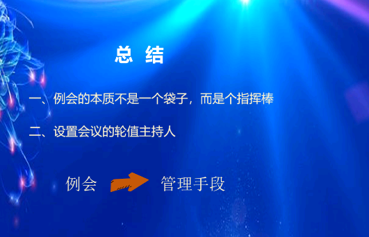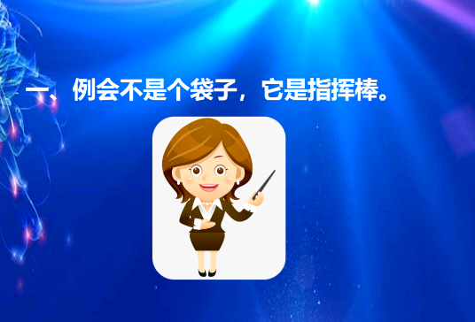例會(hui)這個(ge)問題太常見了,我想請你記住一個原則,就是下面這句話:例會,不(bu)是個袋子,它得是根(gen)指揮棒。