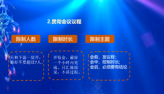 (2)限制時(shi)長開短會,最好一個小時內完(wan)成。只匯報結果,不講過程。