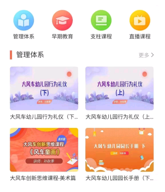 包含投資人、園長管理課程,保育保健、教學教研、兒童早期教育、大風車專供支柱課程等幼兒園教育和家園共育主題課程,