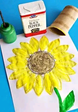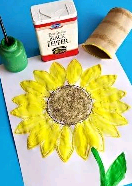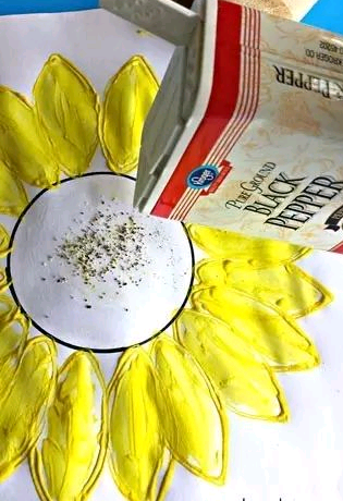 畫(hua)好向(xiang)日葵的花瓣(ban)后,再在中(zhong)間(jian)的圓圈(quan)上(shang)(shang)撒(sa)上(shang)(shang)黑胡(hu)椒,要先涂(tu)上(shang)(shang)不干(gan)膠哦~