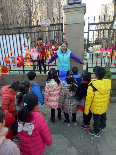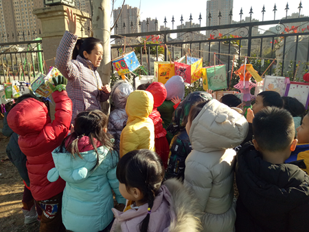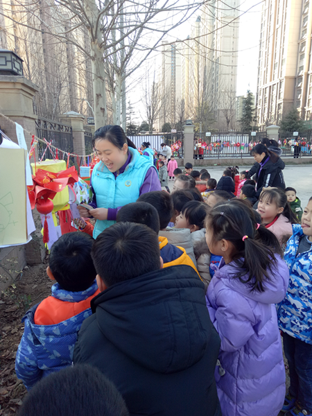 操場上,孩子們在老師的帶領下興致勃勃地觀花燈、猜燈謎,你一言我一語,場面煞是熱鬧,一片喜氣洋洋的景象。