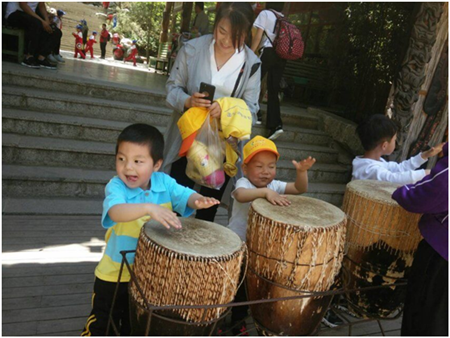 來到非洲部落,孩子們開心的打起了鼓。感受到了不同地域、不同國家的民俗風情。