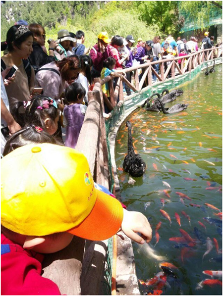 孩子和家長們耐不住心中的喜悅,開始喂魚啦!