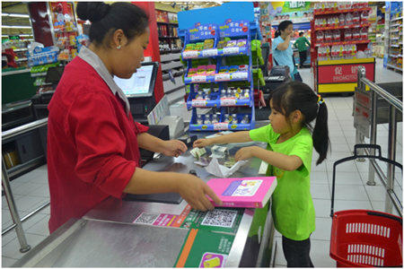 拿著錢、推著購買的禮物,到收銀臺前自己結賬。