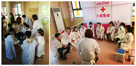 兒童醫院:醫生是個神圣的職業,今天,我們也來體驗一把,穿上白大褂,戴上聽診器,跟老師學習如何自救和搶救別人,抬起擔架,我的小小肩膀上有著重重的責任。