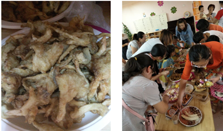 大三(san)班呢,則是以聚餐為主,每一(yi)家庭帶一(yi)道菜,就像一(yi)家人一(yi)樣,團聚在一(yi)起(qi),一(yi)起(qi)分享品(pin)嘗,其樂融(rong)融(rong)。最后也制作(zuo)了月餅。